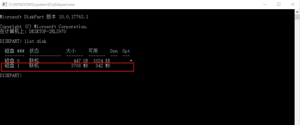 3.再輸入list disk,再按回車,此時即可看到這臺電腦的所有磁盤大致情況,u盤通常是磁盤1。