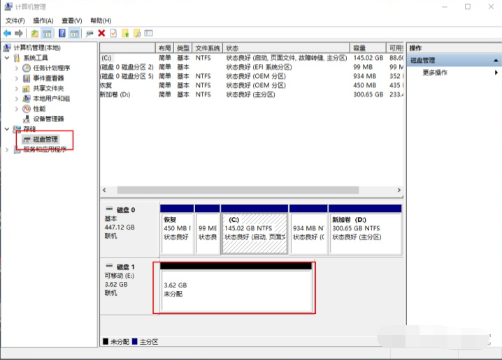 7.進(jìn)入磁盤管理界面,即可看到u盤分區(qū)是未分配的(黑色)。