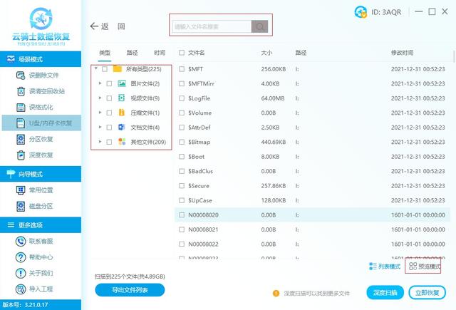 官網(wǎng)下載云騎士數(shù)據(jù)恢復(fù)軟件,安裝后運(yùn)行軟件,將 U 盤通過 USB 接口連接電腦,選擇軟件界面中的 u 盤/內(nèi)存卡恢復(fù)模式,即可看到 U 盤及 U 盤上的分區(qū)信息會在軟件中顯示出來。