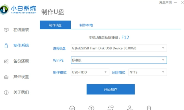 1、首先在電腦上插入u盤,下載小白一鍵重裝系統(tǒng)軟件并打開軟件,然后選擇制作系統(tǒng)功能開始制作啟動U盤。