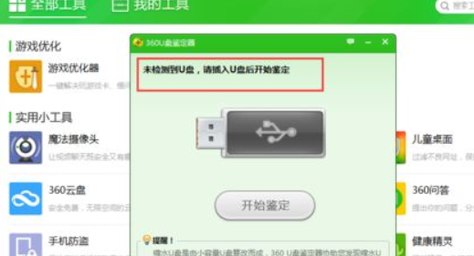 2.添加“U盤鑒定器”以后,此時(shí)會彈出“未檢測到U盤,請插入U(xiǎn)盤后開始鑒定”提示,然后插入U(xiǎn)盤,選擇“開始鑒定”。