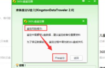 3.、開始鑒定之前會彈出一個(gè)“鑒定風(fēng)險(xiǎn)提示”,鑒定中需要寫U盤數(shù)據(jù),建議鑒定前備份重要資料。