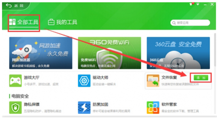 2、選擇全部工具,窗口中尋找文件恢復(fù)點(diǎn)擊添加