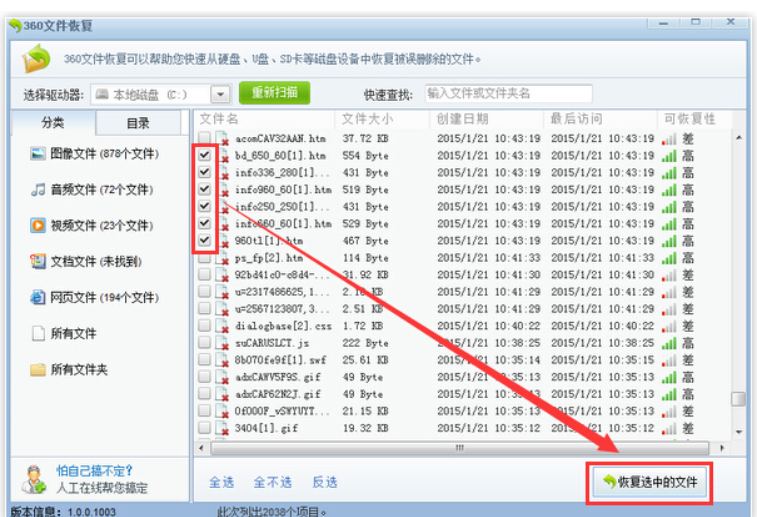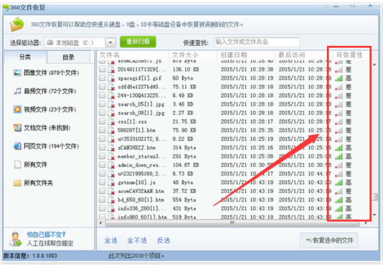 4、掃描進(jìn)行后360文件恢復(fù)作用會(huì)顯示遺失文件的情況,大家見到可恢復(fù)性分成好多個(gè)等級(jí),可以選擇自身要想恢復(fù)的文件試著開展恢復(fù)。此外也有一種是文件夾可恢復(fù)性為空缺的,此文件夾是可以恢復(fù)的,但是文件夾內(nèi)部結(jié)構(gòu)的文件很有可能已經(jīng)被可讀寫,文件夾恢復(fù)后也不一定能尋找需要的文件.