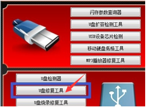 3、點擊“U盤修復工具”按鈕進入U盤量產(chǎn)界面。確保在U盤插入電腦USB接口的前下,程序?qū)棾鋈鐖D所示的“U盤修復”界面中,當U盤被正常識別后,點擊對應(yīng)項左側(cè)的“C”按鈕即可進入自動修復過程。