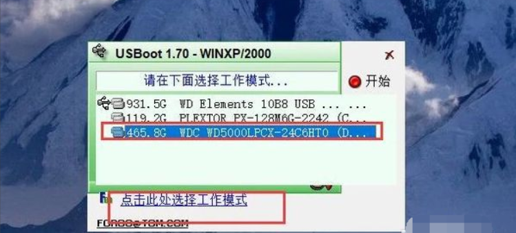 4、選中我們需要進行修復操作的U盤設備,點擊“選擇工作模式”選項。