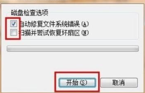 3、在彈出的檢查磁盤窗口中,將“自動修復(fù)文件系統(tǒng)錯誤”和“掃描并嘗試恢復(fù)壞扇區(qū)”兩項全部勾選,然后點擊“開始”進行掃描。
