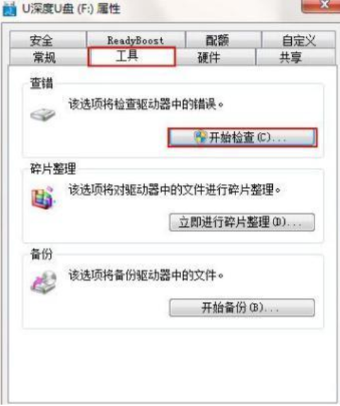 2、在彈出的屬性窗口中,點擊工具選項卡,然后點擊開始檢查,如下圖所示: