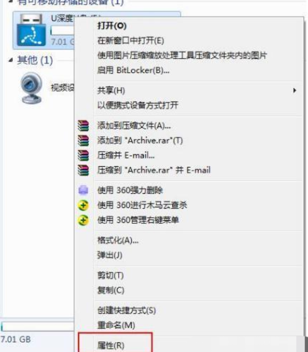 1、打開系統(tǒng)中的資源管理器,選中U盤右鍵點擊U盤選擇“屬性”,如下圖所示: