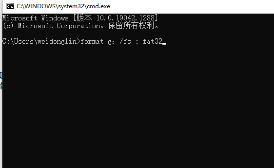2、在命令提示符窗口界面中輸入“format g:/fs : fat32”并且按回車運(yùn)行此運(yùn)算即可。