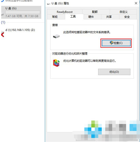 2、在打開的屬性窗口上面鼠標(biāo)點(diǎn)擊工具選項(xiàng)卡,接著在工具選項(xiàng)卡中,鼠標(biāo)點(diǎn)擊檢查。