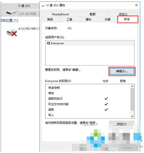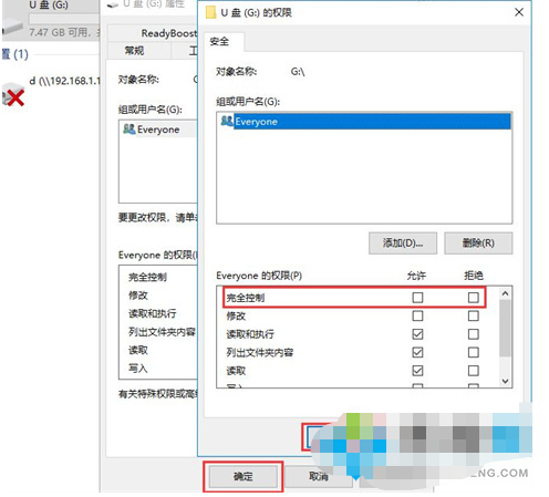 3、在打開的窗口界面上部選中everyone,接著在下方everyone的權(quán)限中勾選完全控制,然后依次點(diǎn)擊確定即可解決無法格式化u盤的問題。