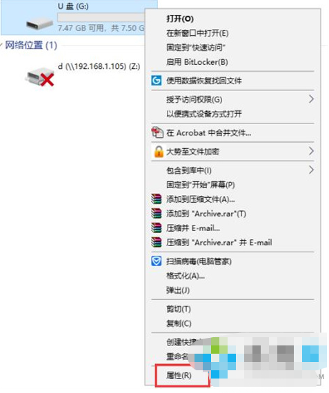 1、一般的邏輯壞道很好進(jìn)行解決,在U盤盤符的上方鼠標(biāo)點(diǎn)擊右鍵,在彈出的窗口界面中點(diǎn)擊屬性。