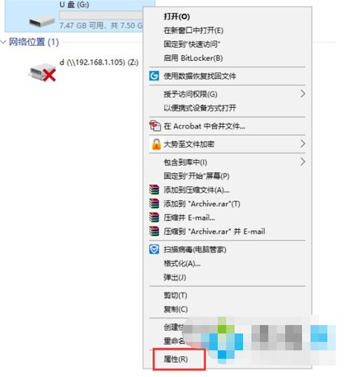 1、在U盤盤符的上方鼠標(biāo)點(diǎn)擊右鍵,在彈出的菜單界面中點(diǎn)擊屬性。