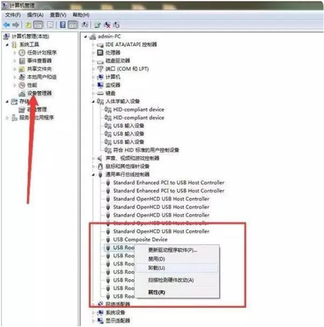 和以上步驟一樣,進入到【通用串行總線控制器】,接著找到自己插入的【USB設(shè)備】,如果沒有被禁止的話,不需要重新啟動,鼠標右鍵選擇【卸載】,將U盤拔出再重新插入電腦,系統(tǒng)會重新加載安裝即可看看是否能讀取U盤。
