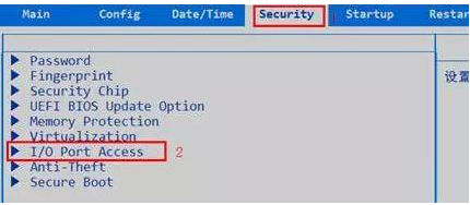 1、一般來(lái)說(shuō),重啟電腦不停按下BIOS快捷鍵就可以進(jìn)入BIOS頁(yè)面。進(jìn)入BIOS頁(yè)面之后,利用方向鍵切換至“Security”選項(xiàng)卡,選擇“I/O Port Access”并按回車。