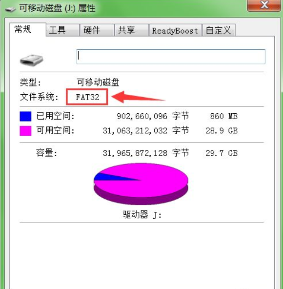 3、此時(shí)即可看到該U盤(pán)格式類型為FAT32,這種格式較早,不支持存放超過(guò)4G的文件,需要更改其格式。