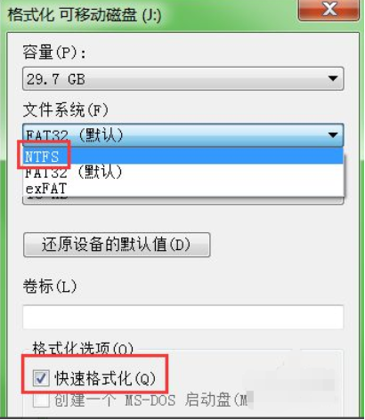 5、然后需要設(shè)置配置選項(xiàng),如圖選擇為NTFS格式,該格式支持大文件,下方快速進(jìn)行格式化選項(xiàng)可以勾選。