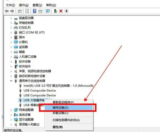 3、通用串行總線控制器下面有個(gè)“USB大容量存儲(chǔ)設(shè)備”,右鍵點(diǎn)擊“禁用設(shè)備”即可恢復(fù)。