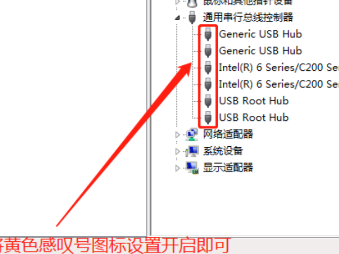 3、最后如果有發(fā)現(xiàn)帶黃色感嘆號的圖標,這標志著USB被禁用,直接啟用即可。