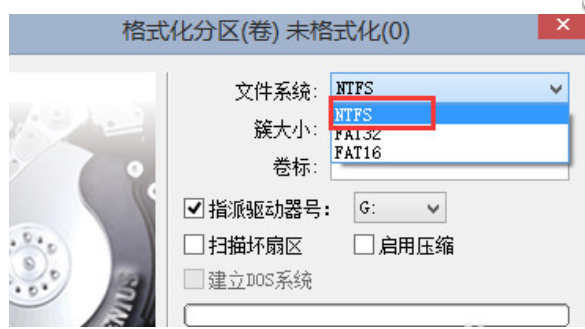 3.文件系統(tǒng)選擇“ntfs”格式。
