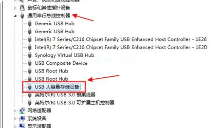 3、在設(shè)備列表中展開,點擊選擇“USB大容量存儲設(shè)備”。