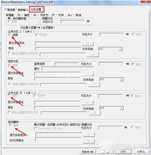 5、在設(shè)置界面的分區(qū)設(shè)置一欄中,會有分區(qū)的具體設(shè)置,包括分區(qū)的大小,卷材和文件系統(tǒng),可以根據(jù)自己的需要來區(qū)別設(shè)置,比如要分出一個usbrom的分區(qū)來作為光驅(qū)使用,那么就點(diǎn)選啟用,點(diǎn)選自動,然后找一個iso格式的系統(tǒng)鏡像加載到程序當(dāng)中。當(dāng)一切設(shè)置完成之后,點(diǎn)擊保存關(guān)閉此設(shè)置界面。