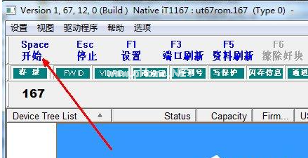 6、當(dāng)設(shè)置好了以后就可以開始u盤量產(chǎn)了,點(diǎn)擊程序左上角的開始按鈕或者直接按鍵盤的空格鍵就可以開始量產(chǎn),量產(chǎn)過程中千萬不要拔除U盤或者斷電,否則不但會量產(chǎn)失敗,還有可能使U盤報廢。