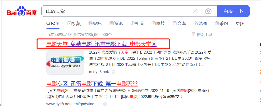 1、打開(kāi)百度搜索頁(yè)面,找到電影天堂,點(diǎn)擊并進(jìn)入。