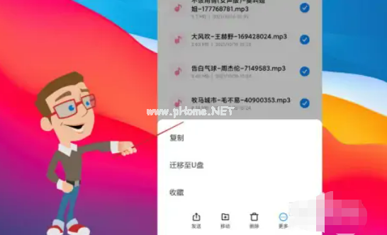 10、選擇以“.mp3”為擴(kuò)展名的歌曲文件,然后點(diǎn)擊屏幕底部的“復(fù)制”。