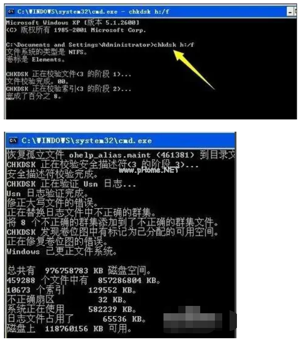 2.從打開的命令提示符界面中,輸入如圖所示的指令,按回車鍵即可完成U盤文件系統(tǒng)的修復(fù)操作。