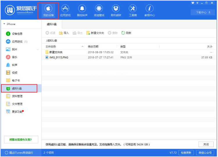 1、愛思助手的虛擬U盤功能,它與實(shí)際的U盤功能相似,所以在忘記帶U盤,確有需要存儲(chǔ)大體積文件的時(shí)候,就可以使用愛思助手的虛擬U盤功能來(lái)存儲(chǔ)。