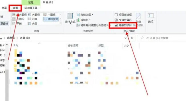 3、接著在菜單欄上點(diǎn)擊“查看”選項(xiàng)卡,勾選“隱藏的項(xiàng)目”選項(xiàng)恢復(fù)隱藏的文件即可找回u盤數(shù)據(jù)。
