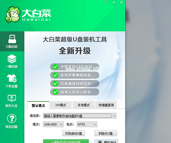 大白菜超級(jí)U盤(pán)啟動(dòng)盤(pán)制作工具這是最近新興的系統(tǒng)軟件,但是因?yàn)樗僮鞅憷钍苎芏嘈』锇橄矏?ài),100%的啟動(dòng)U盤(pán)制作成功率,啟動(dòng)U盤(pán)制作速度相比更加的快速。其PE系統(tǒng)安裝后擁有極速啟動(dòng)功能,而且還擁有萬(wàn)能U盤(pán)的啟動(dòng)文件等等功能,通過(guò)精心優(yōu)化的PE系統(tǒng)更加精致,更加適用各大粉絲,這款軟件安全性也很好,大家可以放心使用。