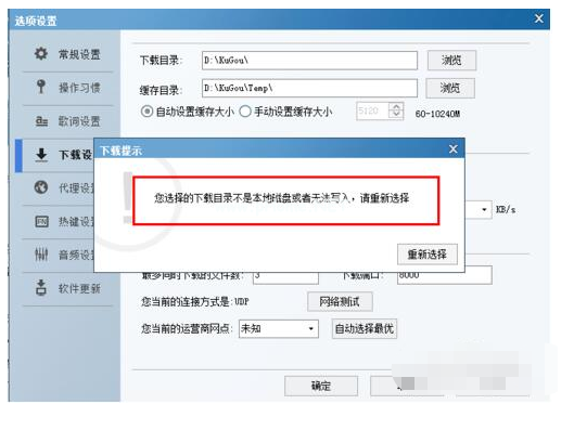 2、小編這里以酷狗音樂為例,在酷狗里面搜索喜歡的歌曲點(diǎn)擊下載按鈕,一般酷狗下載的歌曲文件放在D盤的KuGou文件夾界面里,下載設(shè)置項(xiàng)就能看到下載目錄了。但是不可以直接在這里把目錄改成U盤,因?yàn)閁盤不是本地磁盤所以會出現(xiàn)下面的提示。我們其實(shí)可以在D盤的KuGou文件夾里面把歌曲全部選中然后右鍵復(fù)制到U盤里面或者右鍵發(fā)送到可移動設(shè)備即可。