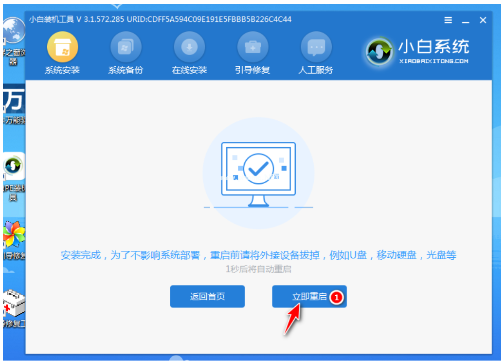 7、當(dāng)提示安裝完成后,立即重啟電腦。