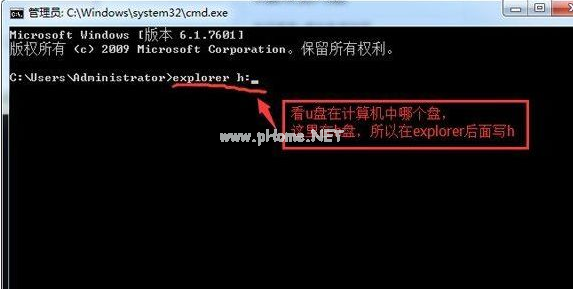 3.在剛剛打開(kāi)的管理員命令窗口中輸入“explorer h:”命令(“h”為當(dāng)前u盤盤符),按回車鍵執(zhí)行操作。