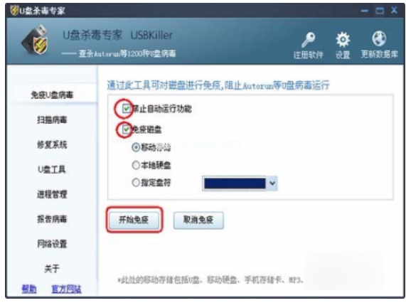 2.選擇免疫U盤病毒模式,勾選防止自動運行功能和免疫功能。點擊開始免疫。