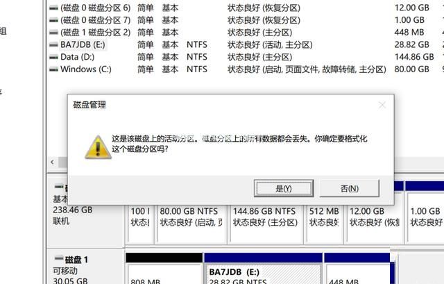 4、在彈出的對話框 磁盤管理 ,這是該磁盤上的活動(dòng)分區(qū),磁盤分區(qū)上的所有數(shù)據(jù)都會(huì)丟失,你確定要格式化這個(gè)磁盤分區(qū)嗎?點(diǎn)擊是,即可格式化磁盤。反之不做任何操作。