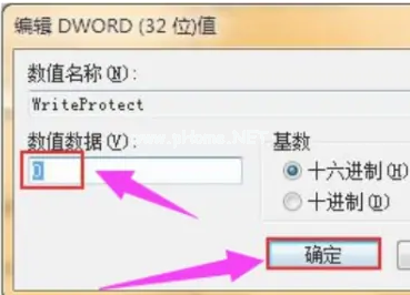 5、雙擊打開WriteProtect,把數(shù)值數(shù)據(jù)改為“0”,點擊“確定”選項。