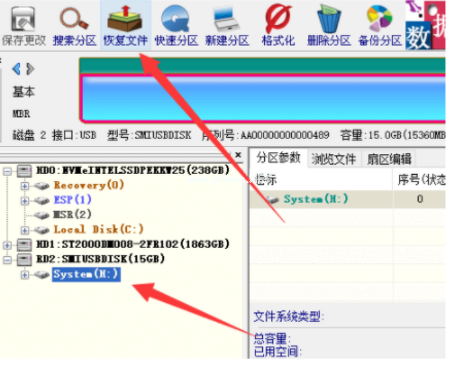 2、在軟件中找到并點(diǎn)擊丟失數(shù)據(jù)的U盤分區(qū),然后點(diǎn)擊 軟件上方的"恢復(fù)文件"按鈕。