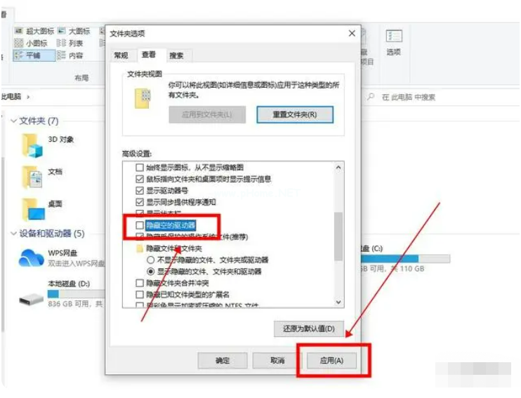 3、在高級設置中,取消勾選“隱藏空的驅動器”,點擊“應用”就可以顯示出隱藏的u盤盤符。