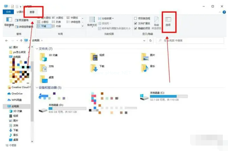 1、先將U盤插入電腦,進入“此電腦”,點擊“查看”下的“選項”。