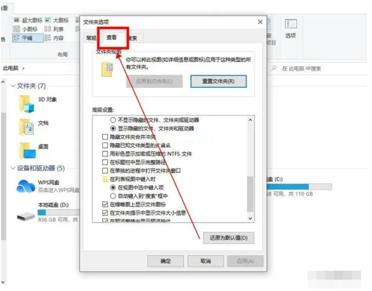 2、進入文件夾選項界面,點擊“查看”選項卡。