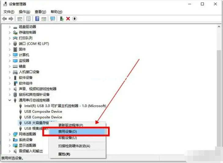 3、通用串行總線控制器下面有個“USB大容量存儲設備”,點擊“禁用設備”即可恢復。