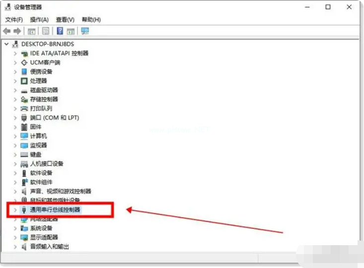 2、在設備管理器窗界面,找到并點擊“通用串行總線控制器”。
