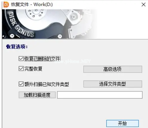 2、進(jìn)入恢復(fù)文件窗口中,默認(rèn)設(shè)置并點(diǎn)擊“開(kāi)始”按鈕開(kāi)始掃描。