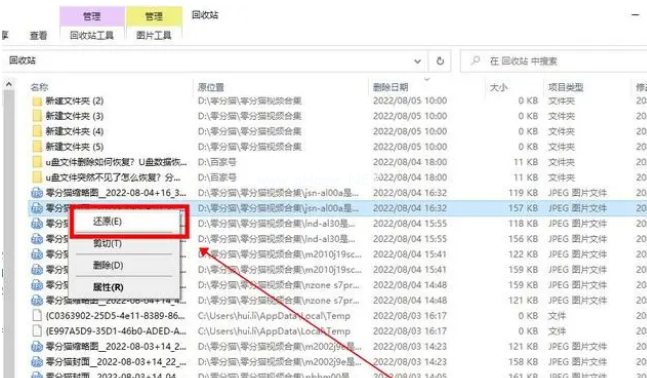 2、選中文件之后,右鍵文件點(diǎn)擊“還原”,這樣就可以將文件恢復(fù)到原來(lái)的位置。