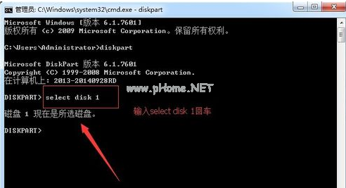 3.再輸入“select disk 1”命令(注意:寫(xiě)1就是一個(gè)u盤,兩個(gè)就寫(xiě)2,以此類推)。