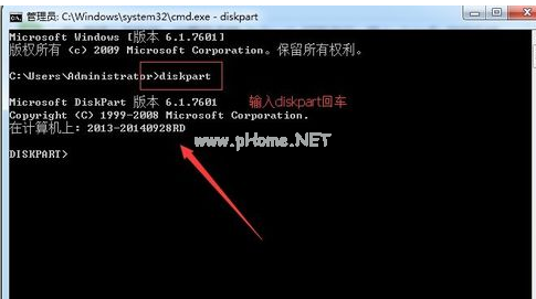 2.在打開(kāi)的窗口中輸入“diskpart”,按回車鍵執(zhí)行。